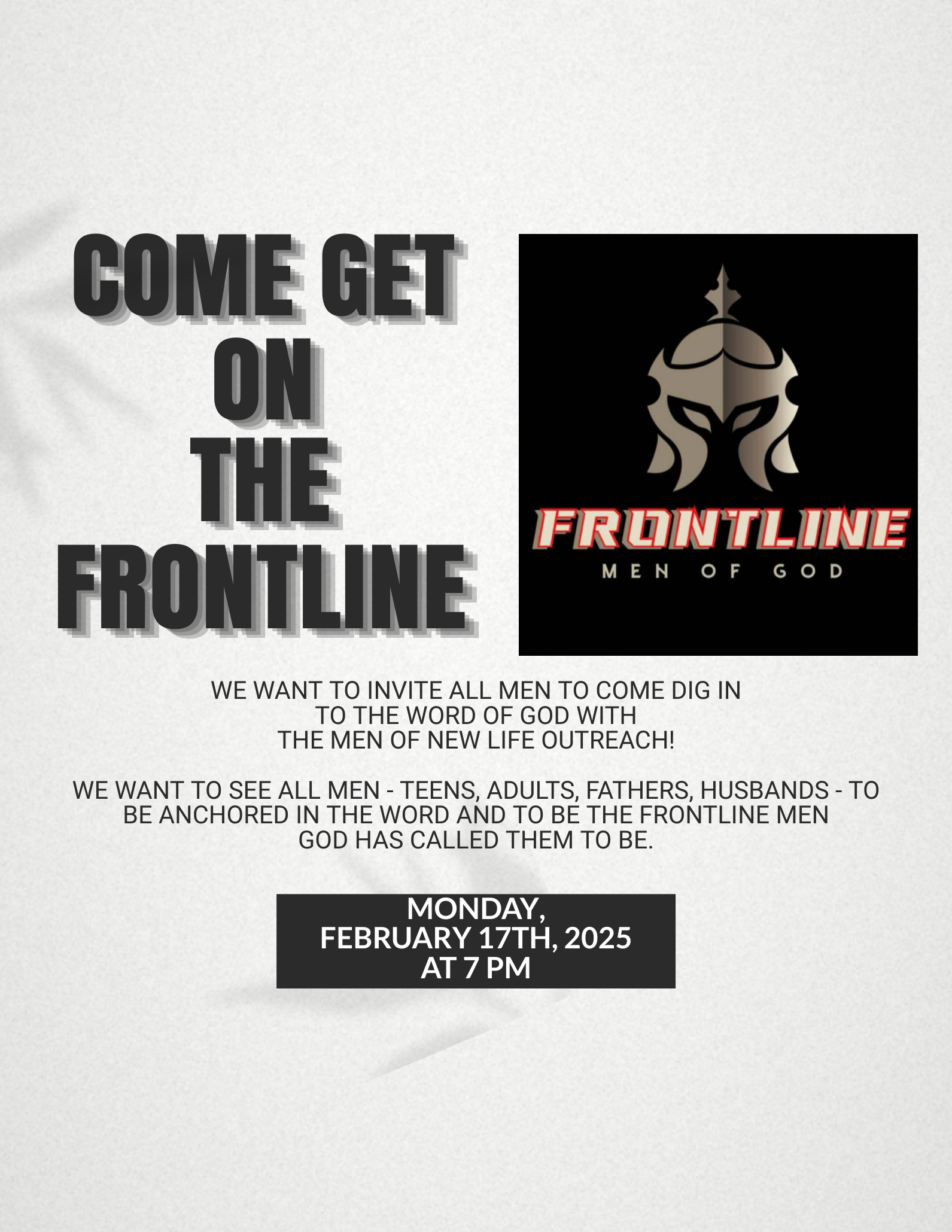 Our next Frontline Men of God Meeting is February 17, 2025 at 7:00 pm!
